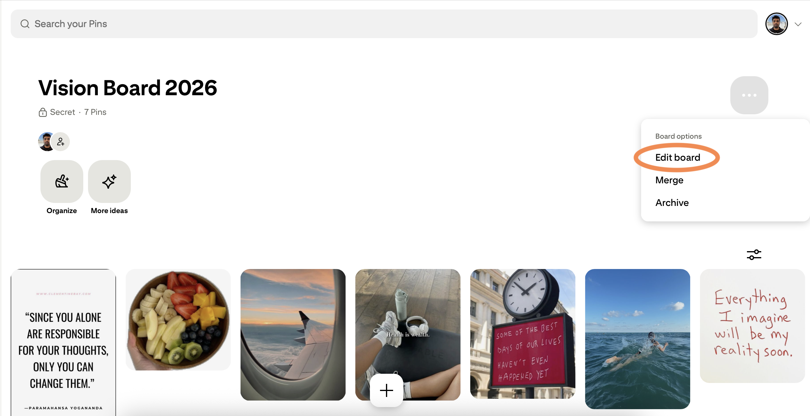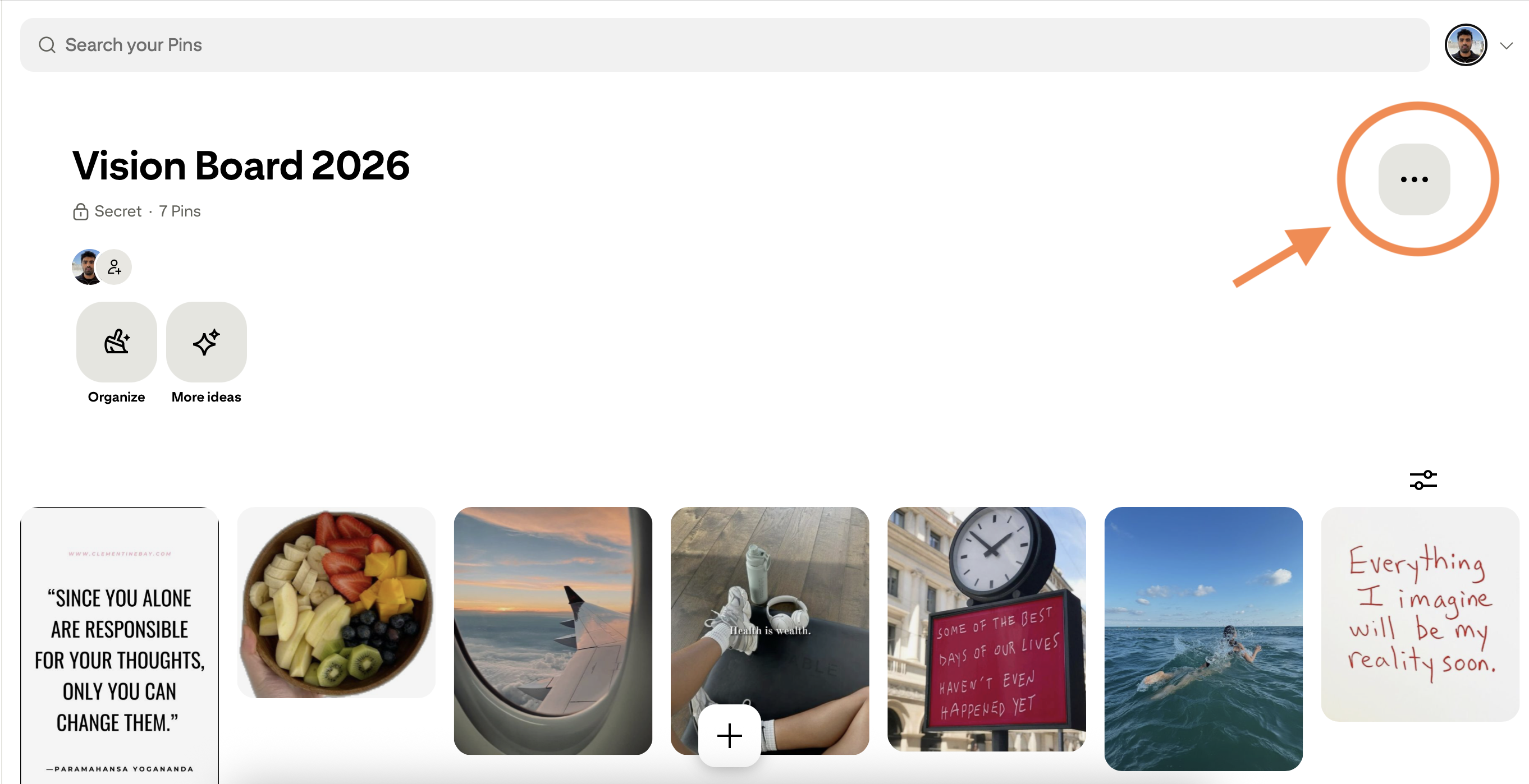 Go to your board on Pinterest. Look for the "..." button in the top-right corner of your board.
